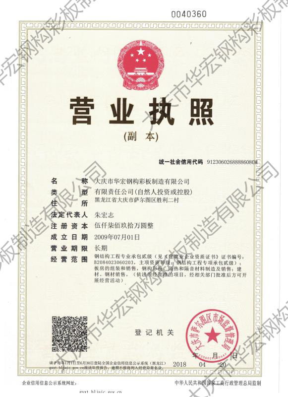 華宏鋼構(gòu)始建于2009年8月9日,總部位于大慶市薩爾圖區(qū)南一路13號(hào),現(xiàn)有大慶市華宏鋼構(gòu)彩板制造有限公司、黑龍江省華宏力安綠建科技有限公司、大慶市華宏鋼構(gòu)彩板制造有限公司長春分公司、黑龍江省海森新材料科技有限公司、大慶市瑞和通螺栓廠五家工業(yè)企業(yè)形成了以彩板復(fù)合板、裝配式鋼結(jié)構(gòu)建筑、保溫材料、配件制造為主的五大生產(chǎn)基地,占地總面積 20余萬平方米,生產(chǎn)車間5萬平方米。中高層管理干部26 人,高級(jí)工程師9人,各類國家注冊(cè)執(zhí)業(yè)人員 32 人,車間技工 260人,專業(yè)安裝隊(duì)伍 10 余支,帶動(dòng)就業(yè) 500